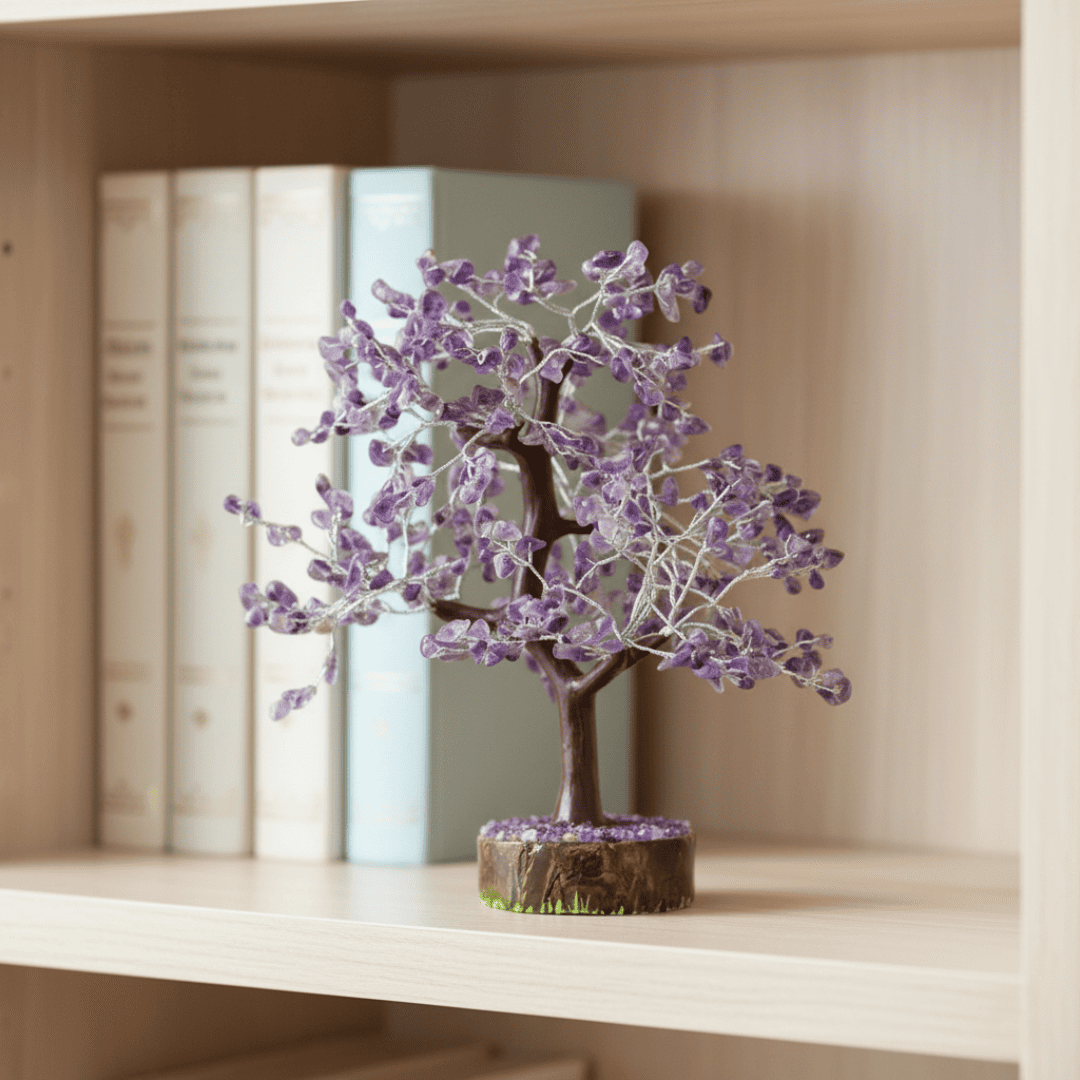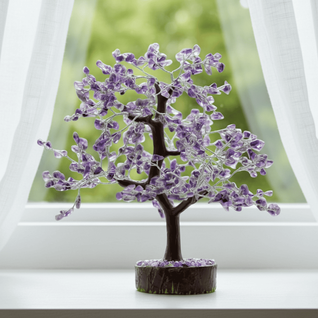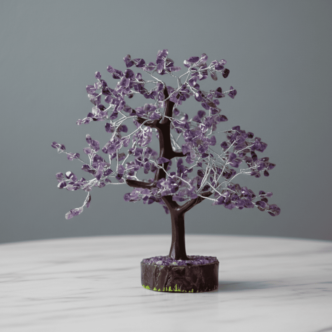 Invite wealth, spiritual clarity, and protective energy into your home with this beautiful Handmade Amethyst Gemstone Tree. Meticulously crafted with approximately 300 polished Amethyst chips wired onto golden branches, this tree is rooted in a supportive base. As a Feng Shui item, this tree is a powerful symbol of stability, growth, and a long life blessed with abundance.
