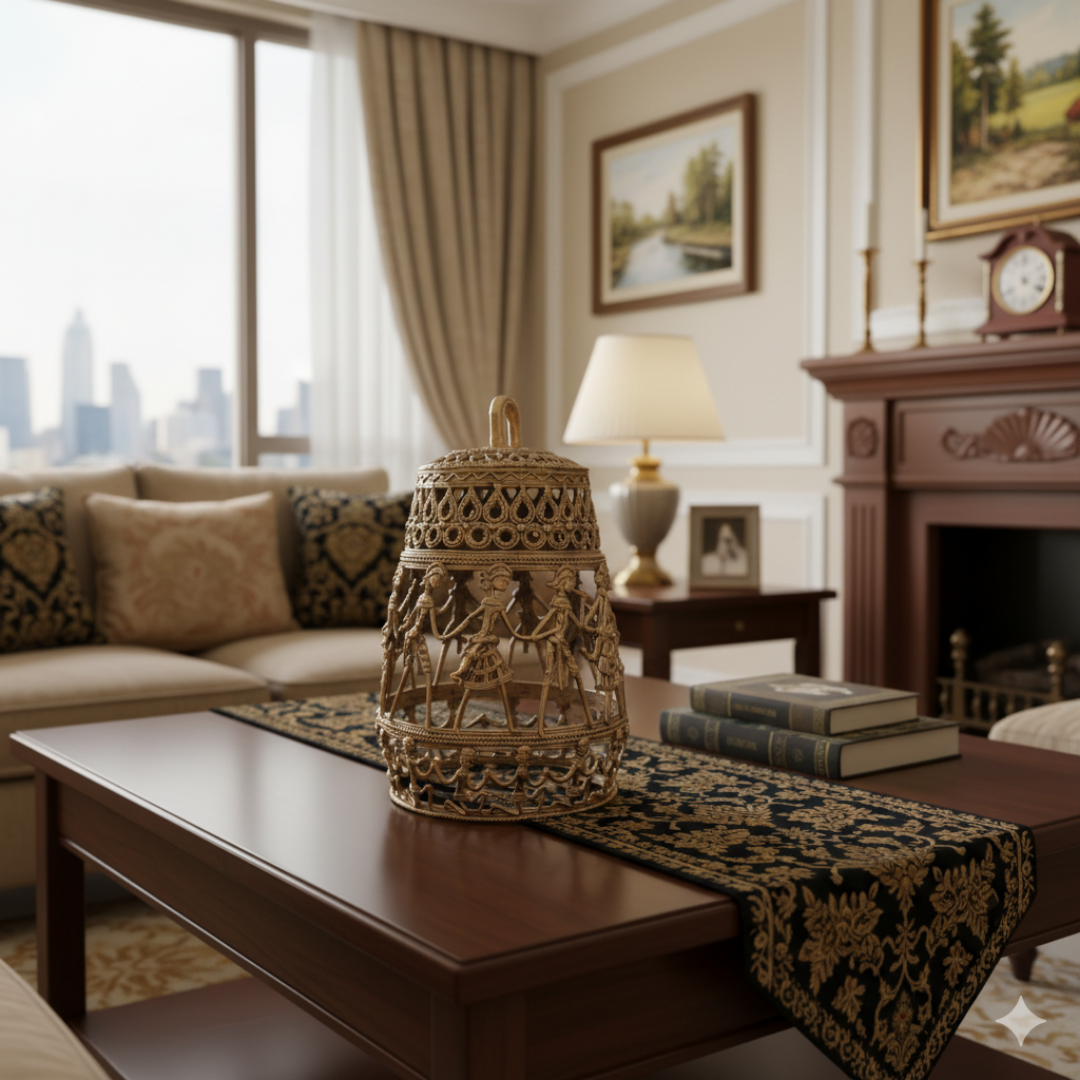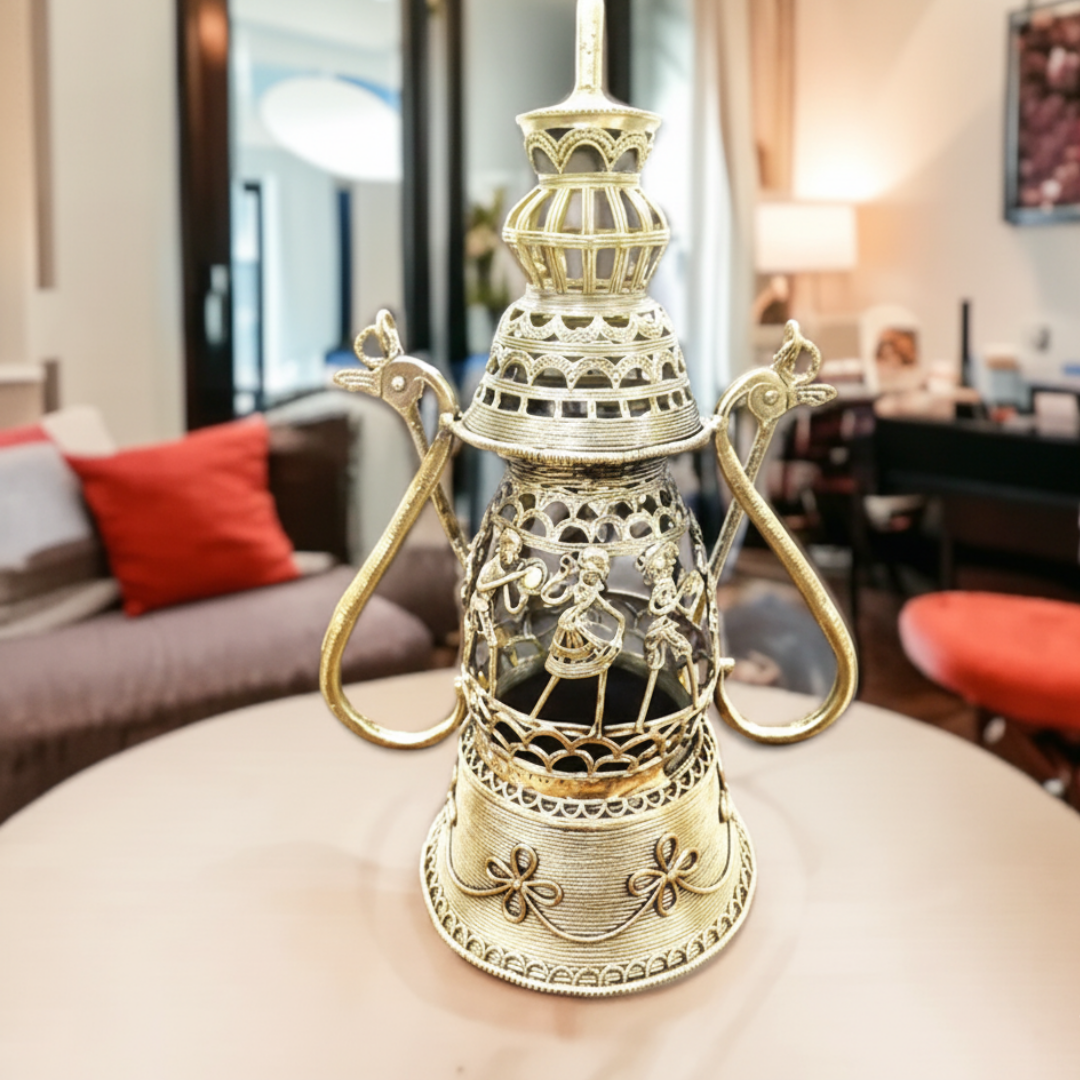 Dhokra art brass handmade cylindrical shaped lamps with tribal figurines. Ideal for your home/gifting option. Can be hanged or used as a table top artifact.