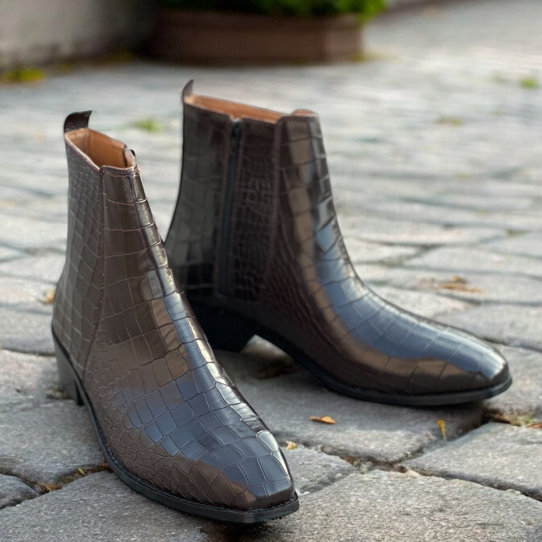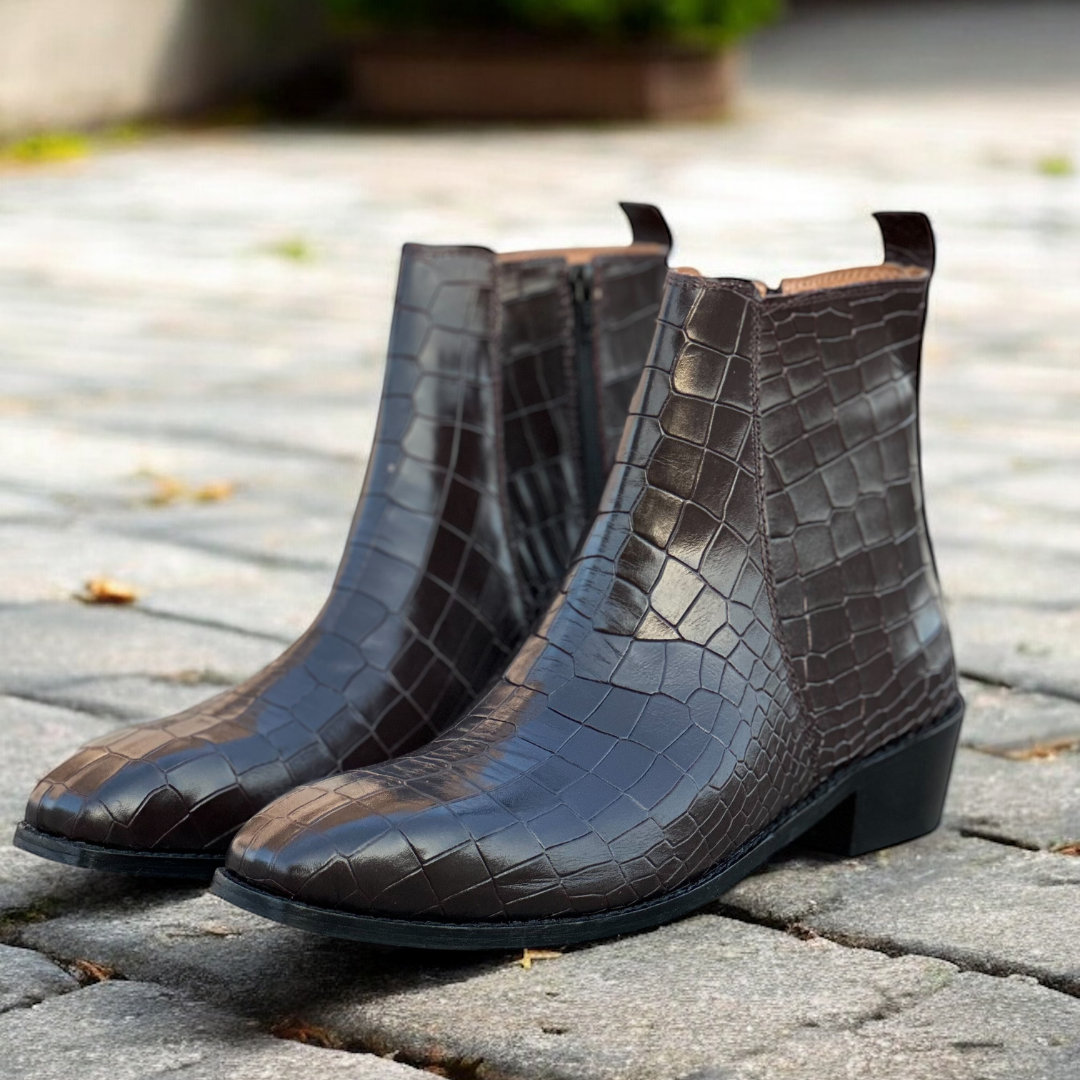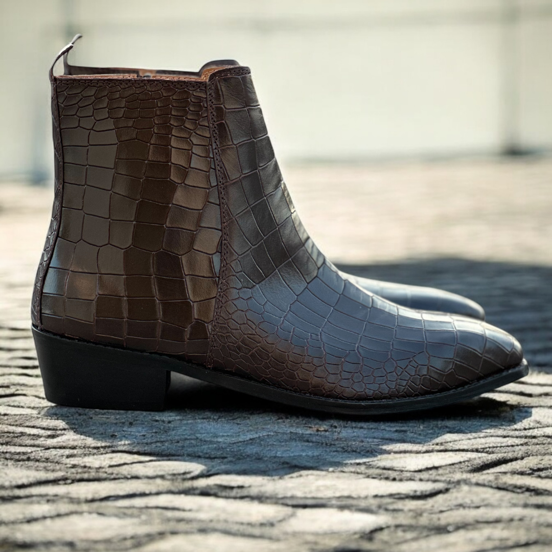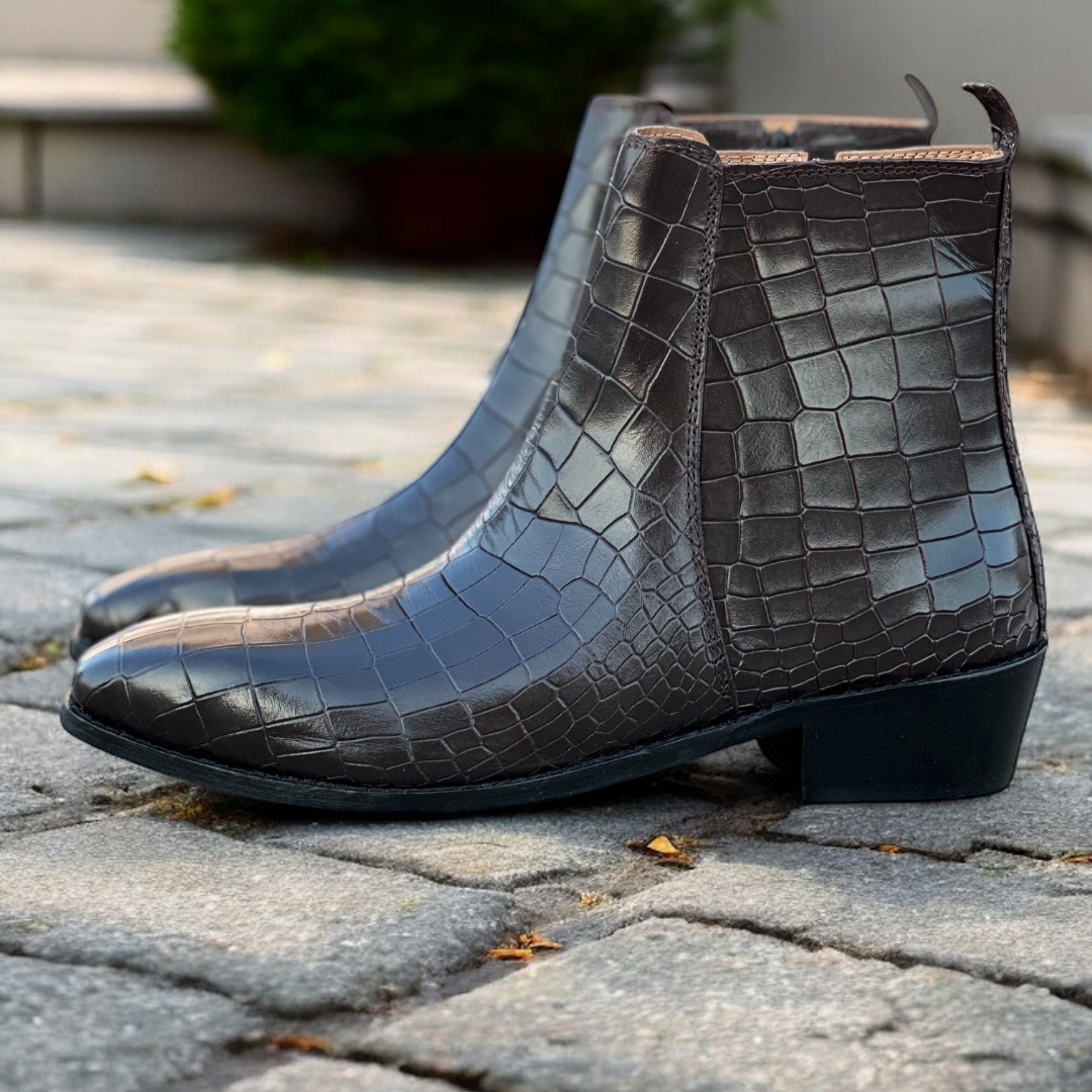 Step into sophistication with the Dark Oak Legacy Chelsea Boots – a masterpiece of craftsmanship and bold style. Designed with an exotic crocodile-textured leather finish, these boots exude power, confidence, and timeless luxury.