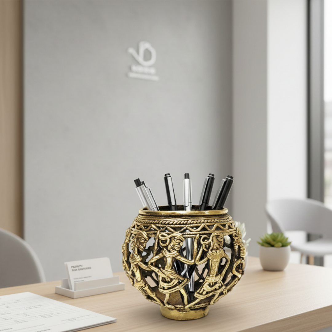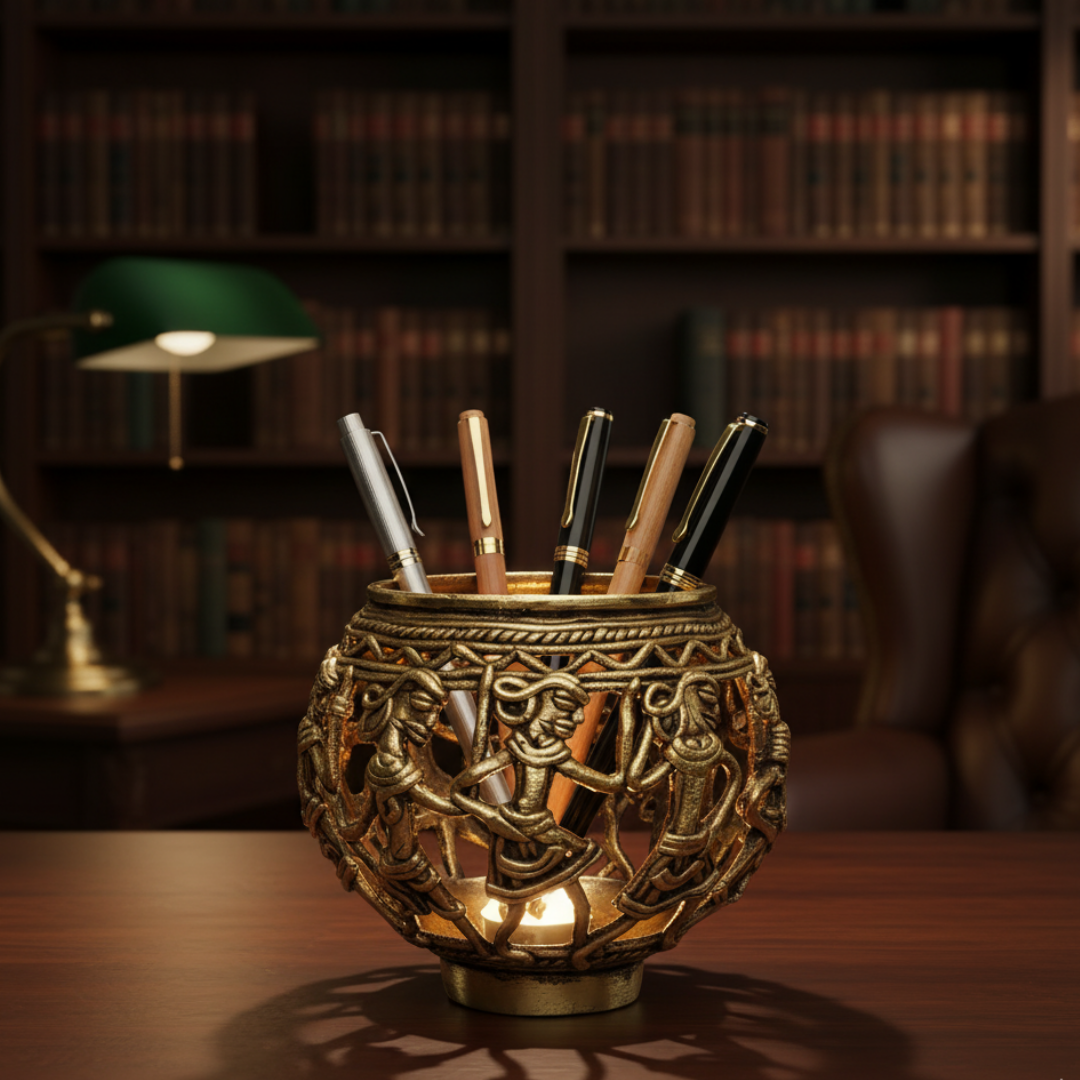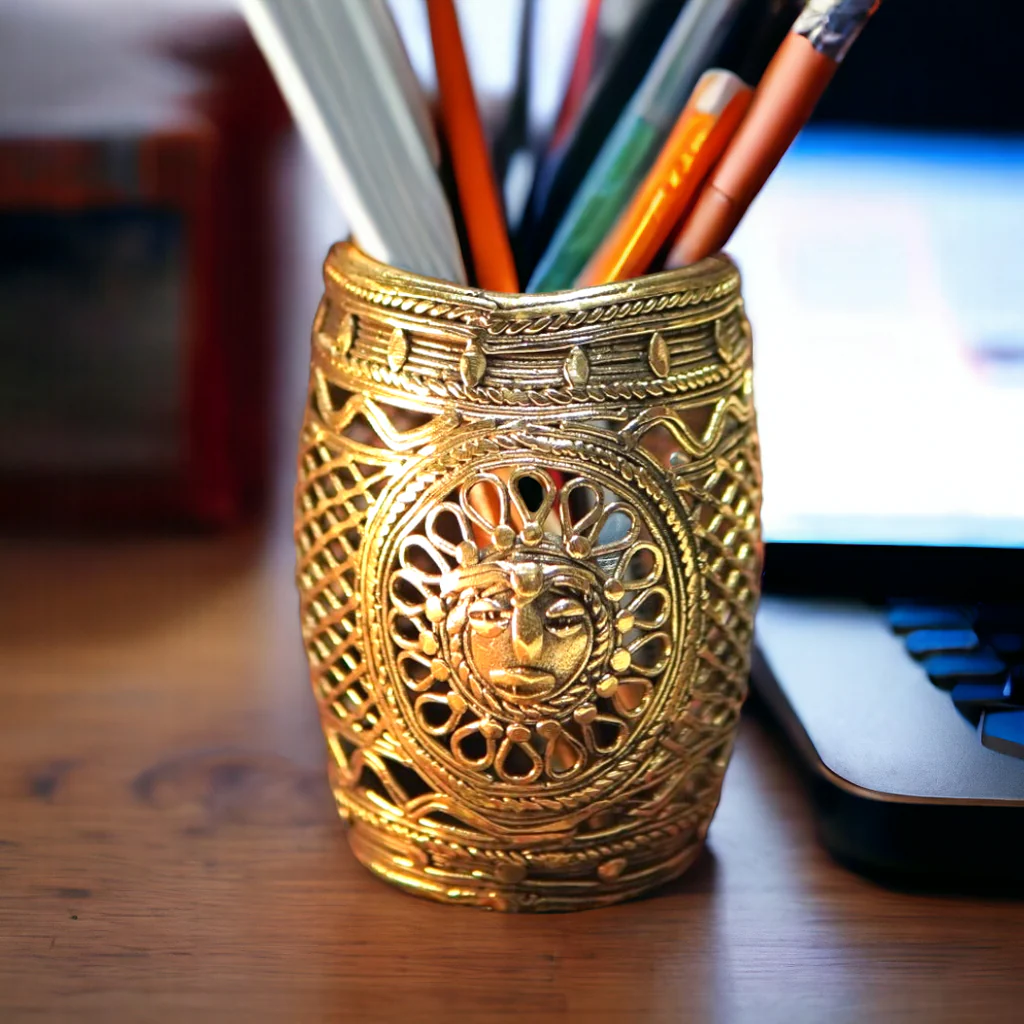 Unique Brass handmade Dhokra Art Pen/Cutlery/ Tea Light Holder with very fine intricate mesh like art work. Ideal for your home or as a gifting option. Made by expert tribal artisans of Chhattisgarh.