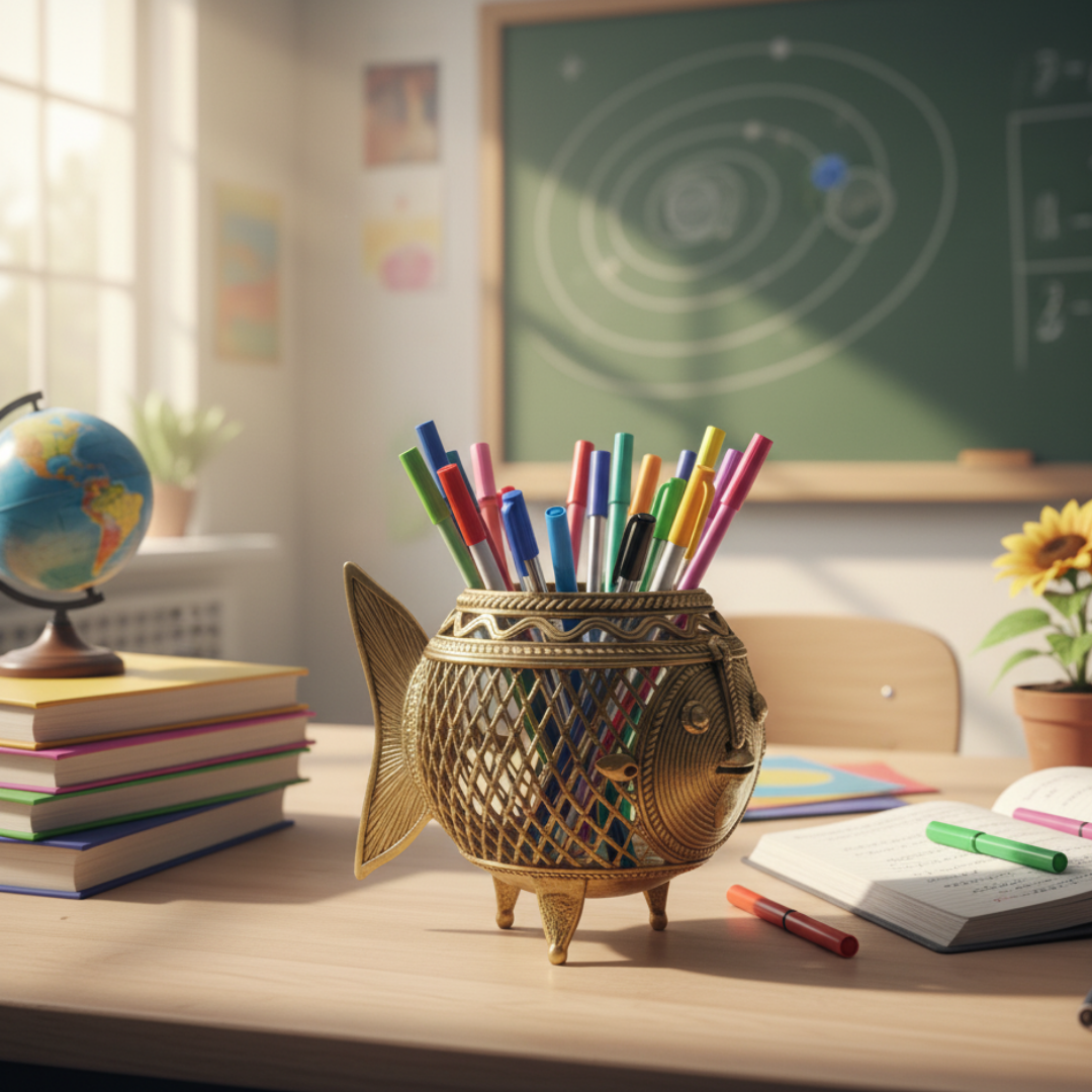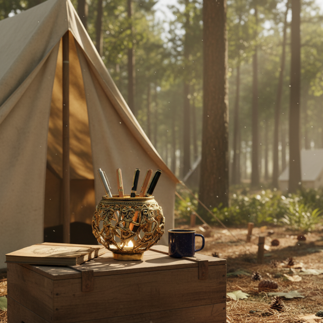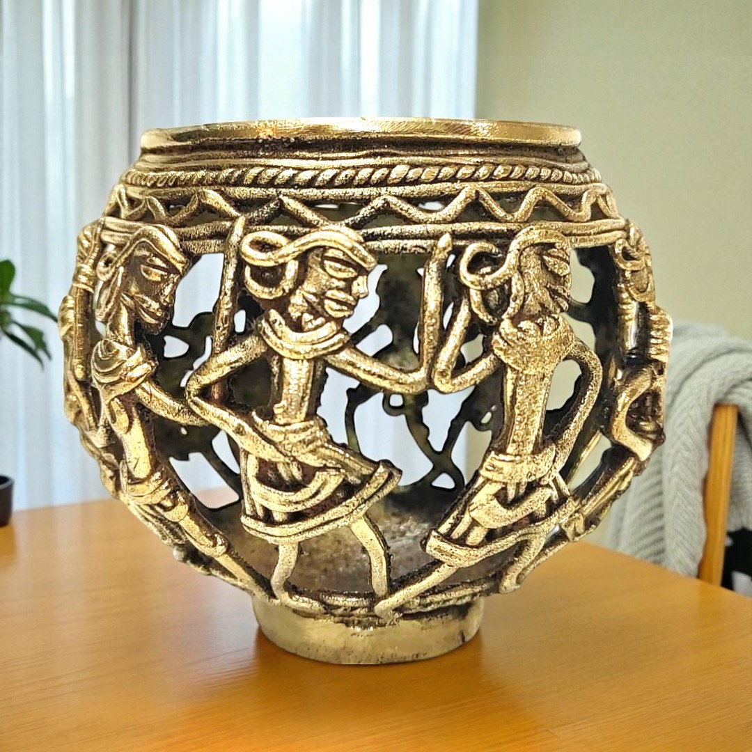 Unique Brass handmade Dhokra Art Pen/Cutlery/ Tea Light Holder with very fine intricate mesh like art work. Ideal for your home or as a gifting option. Made by expert tribal artisans of Chhattisgarh.
