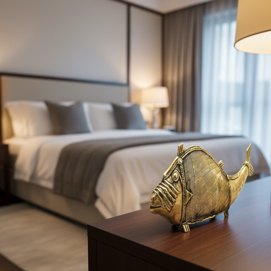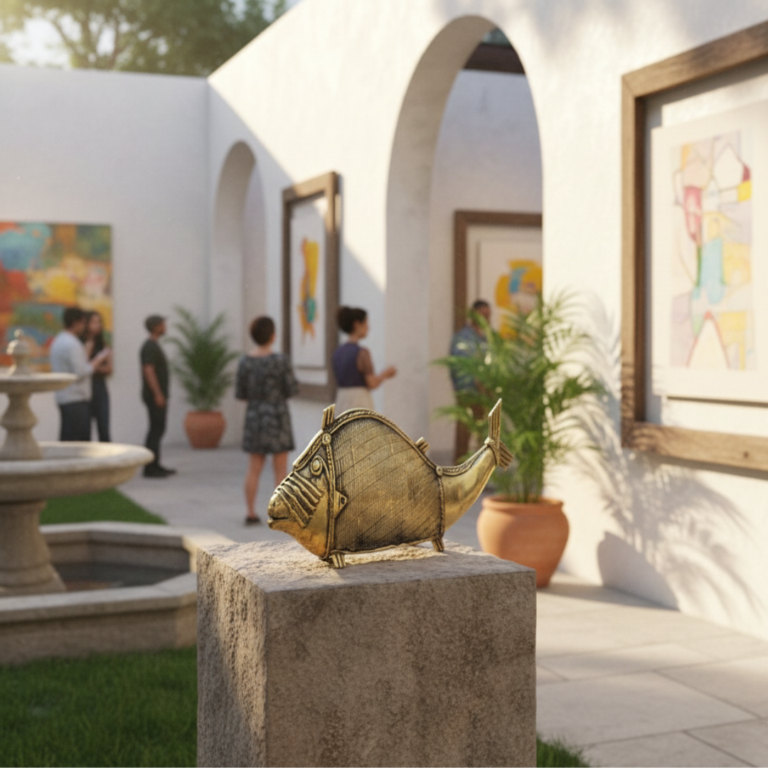 Dhokra Art Handmade Brass (bell metal) Fish Statue from Realcrafts. This very unique design dokra fish is ideal for your home decor or as an ethnic gifting option. Made by expert artisans of Chhattisgarh.