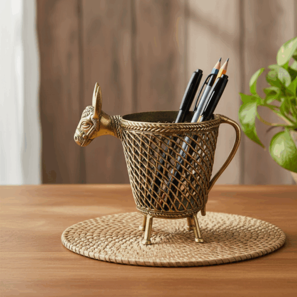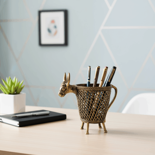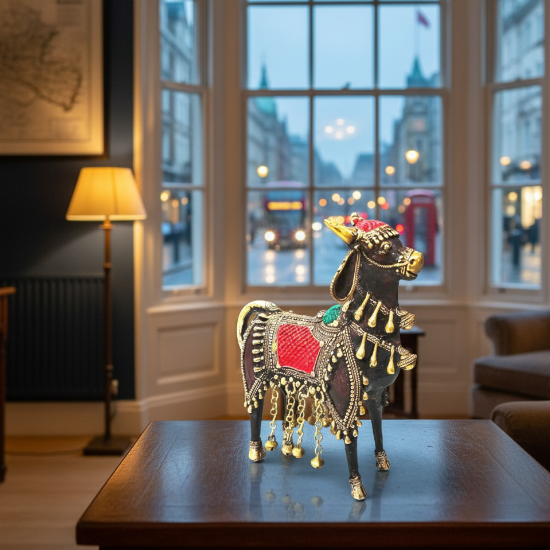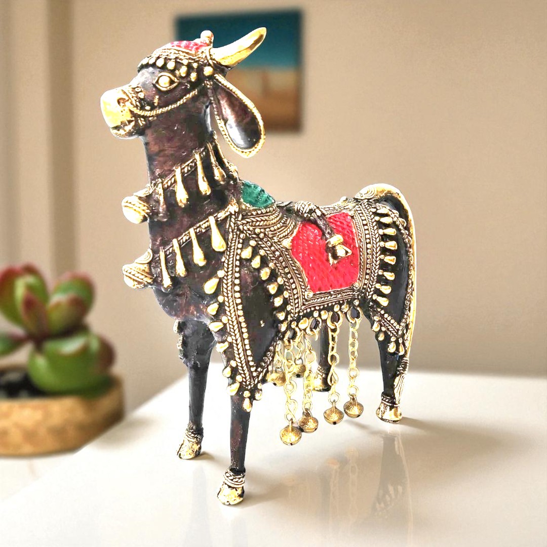This exquisite handmade Dhokra Art Standing Five Legged Nandi (bull) with Bells statue is a perfect addition to any collection.