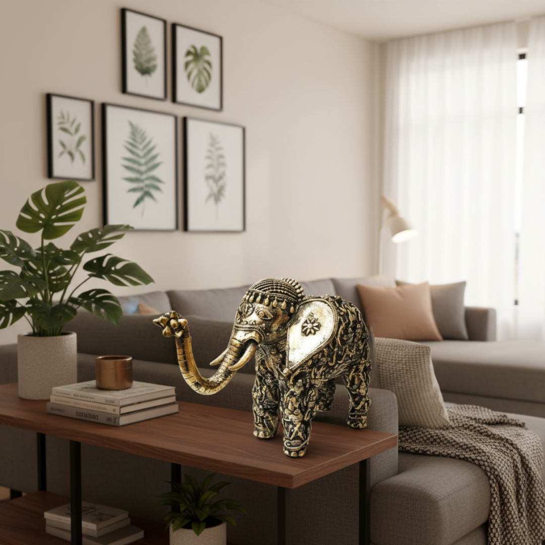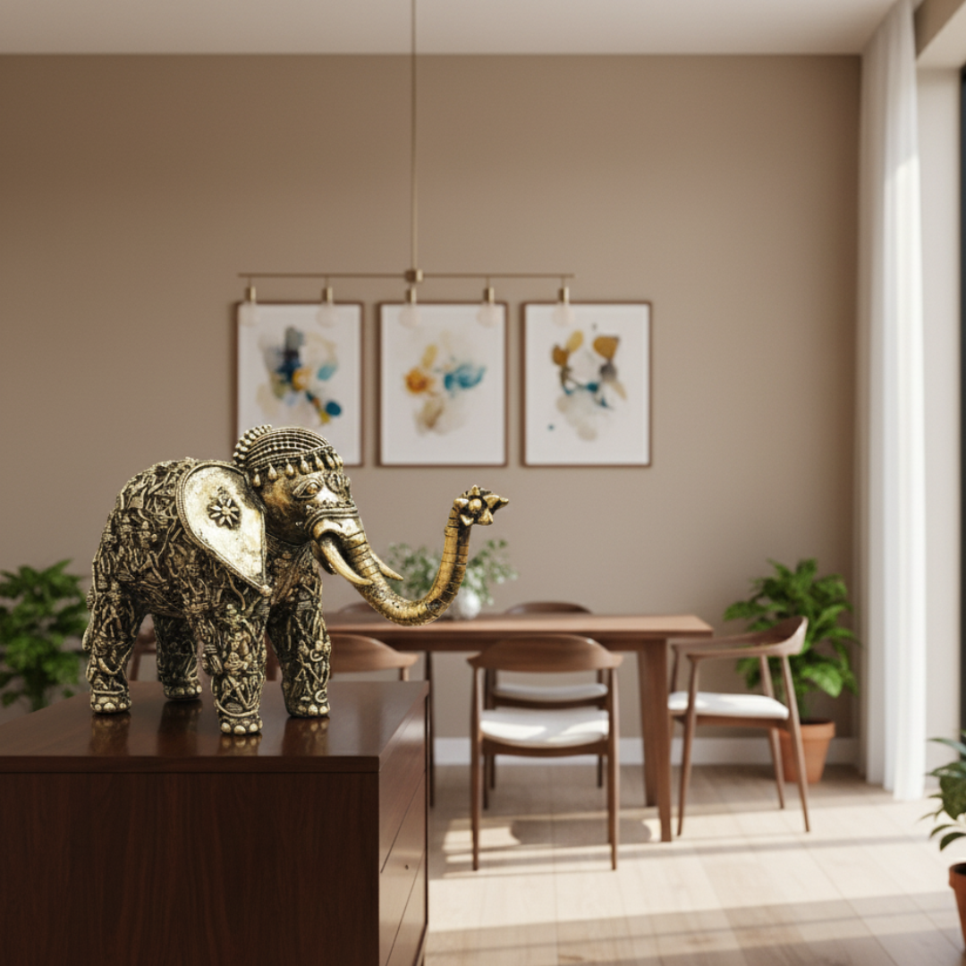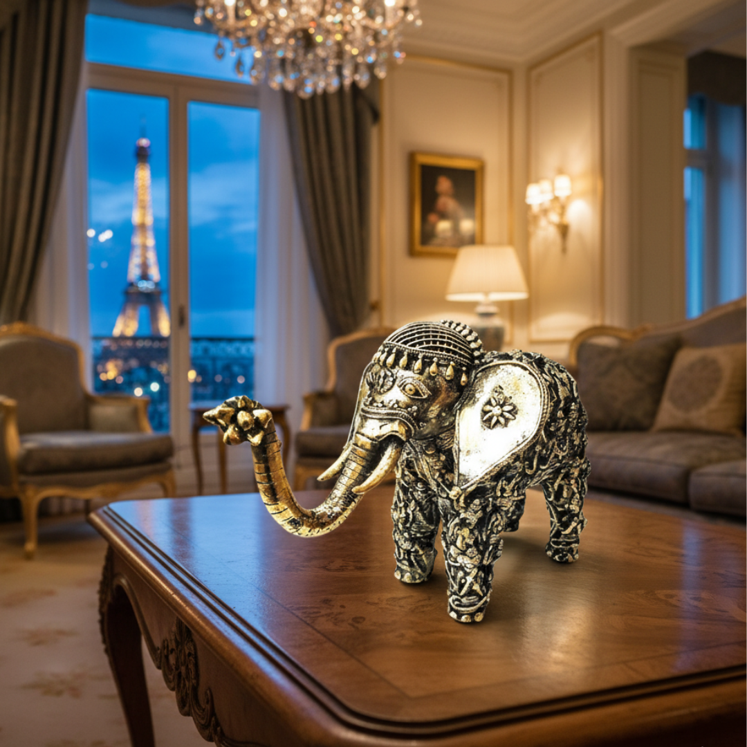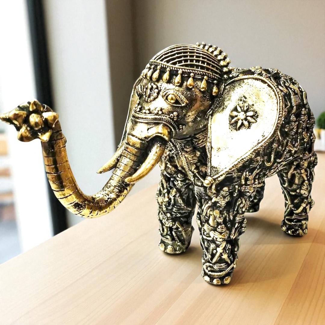 Beautiful Dhokra Art Brass Handmade Elephant Statue with Tribal Human Figures all over the body. A very unique and distinctive artifact, which is ideal for your home or as a gifting option.
