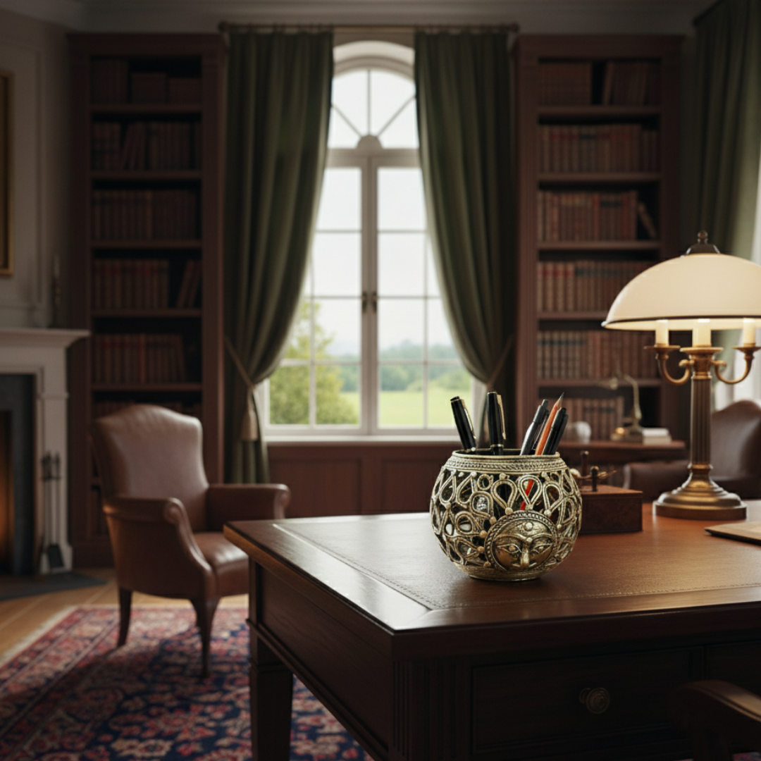 Beauty with Utility. Brass handmade Pen/Cutlery stand with very fine art work in Sun & Drops Design. Handcrafted by expert artisans of Chhattisgarh.