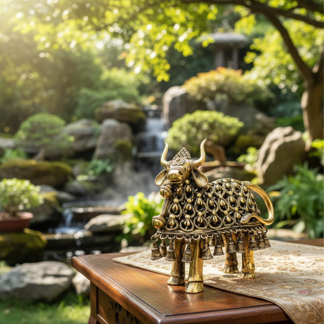 Dhokra Art Handcrafted Brass Hollow Nandi with Bells (Ghanti Nandi) statue which is ideal for your home/office or as an ethnic gifting option.