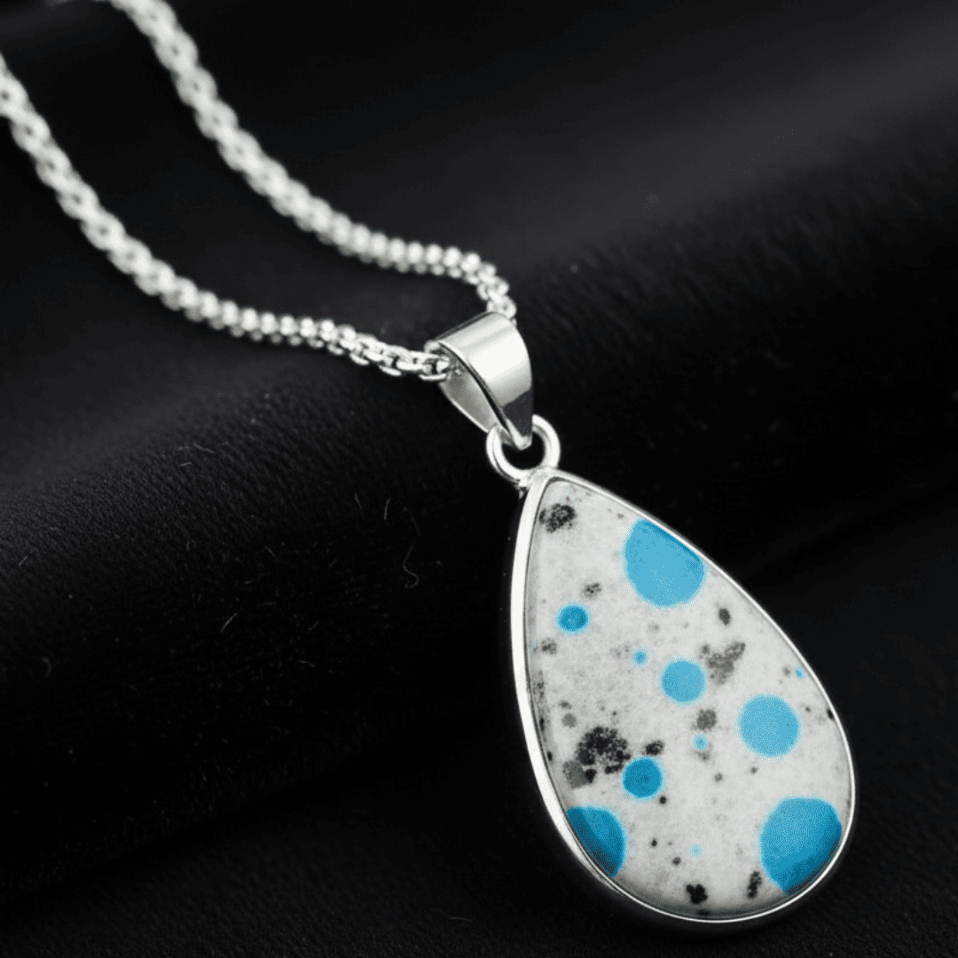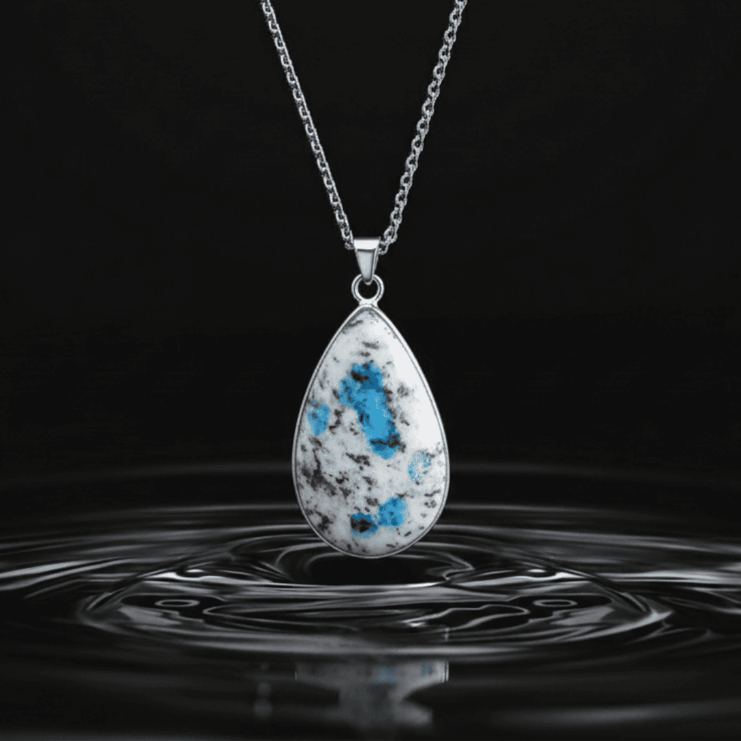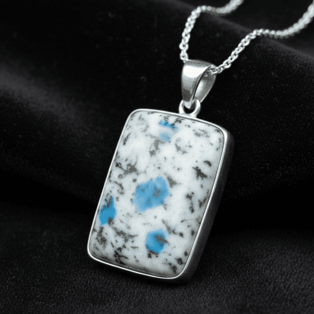 Adorn yourself with the unique power of the Natural K2 Jasper Gemstone Pendant, a rare and mesmerising crystal found solely at the base of K-2, the world’s second-highest mountain. This striking stone features vibrant blue Azurite inclusions embedded in a white and black granite matrix, perfectly embodying the merging of earthly grounding and celestial wisdom.
