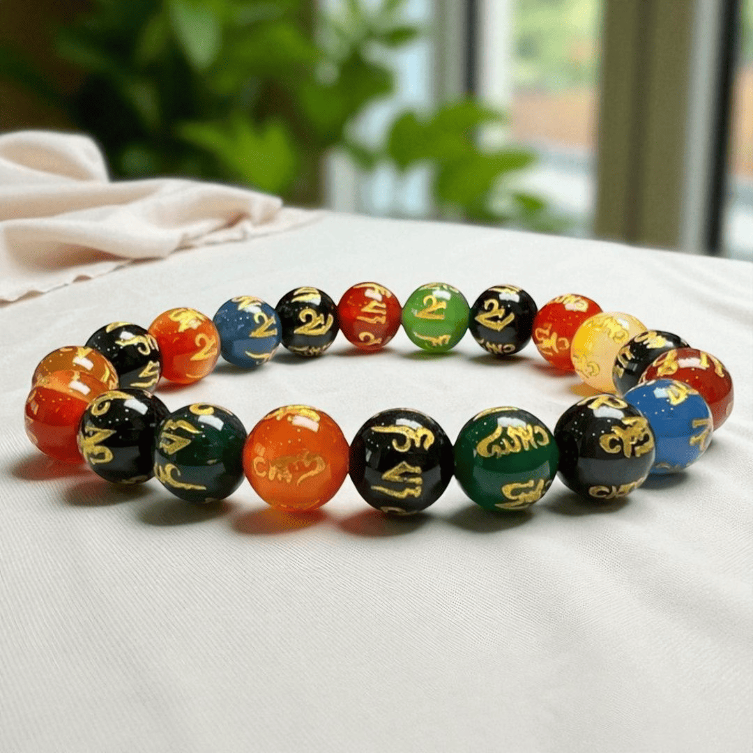 Adorn your wrist with the profound power of the Om Mani Padme Hum Engraved Stone Bracelet. This vibrant Round bracelet features colourful Gemstone beads, each meticulously etched with a syllable of the sacred Tibetan Buddhist mantra, known as the essence of all compassion and wisdom. Wearing this bracelet serves as a constant reminder to cultivate generosity, ethics, patience, perseverance, concentration, and wisdom.