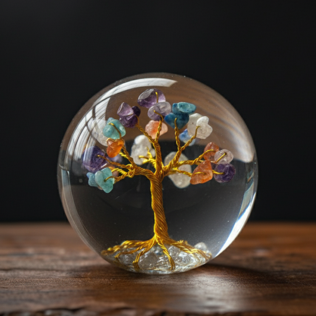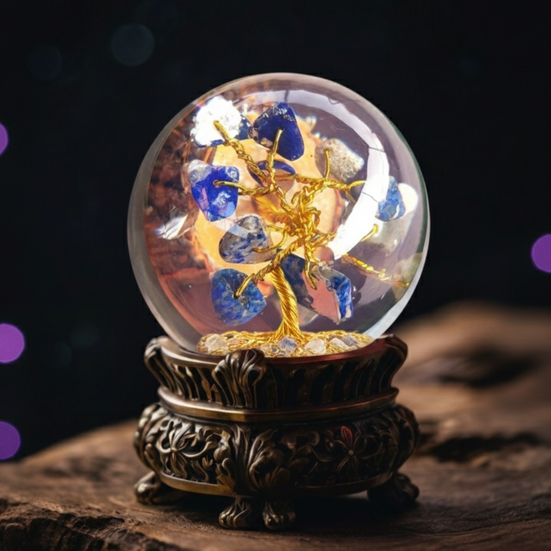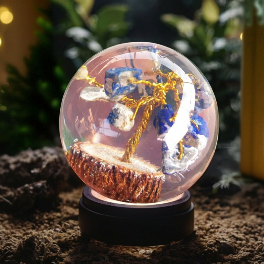 Elevate your space with this enchanting Orgone Sphere Crystal Ball, featuring a delicate, handcrafted gemstone tree encapsulated within a clear resin orb. This unique piece perfectly merges the spiritual power of Orgone technology (designed to amplify and harmonise energy) with the symbolism of the Money Tree and the Tree of Life.