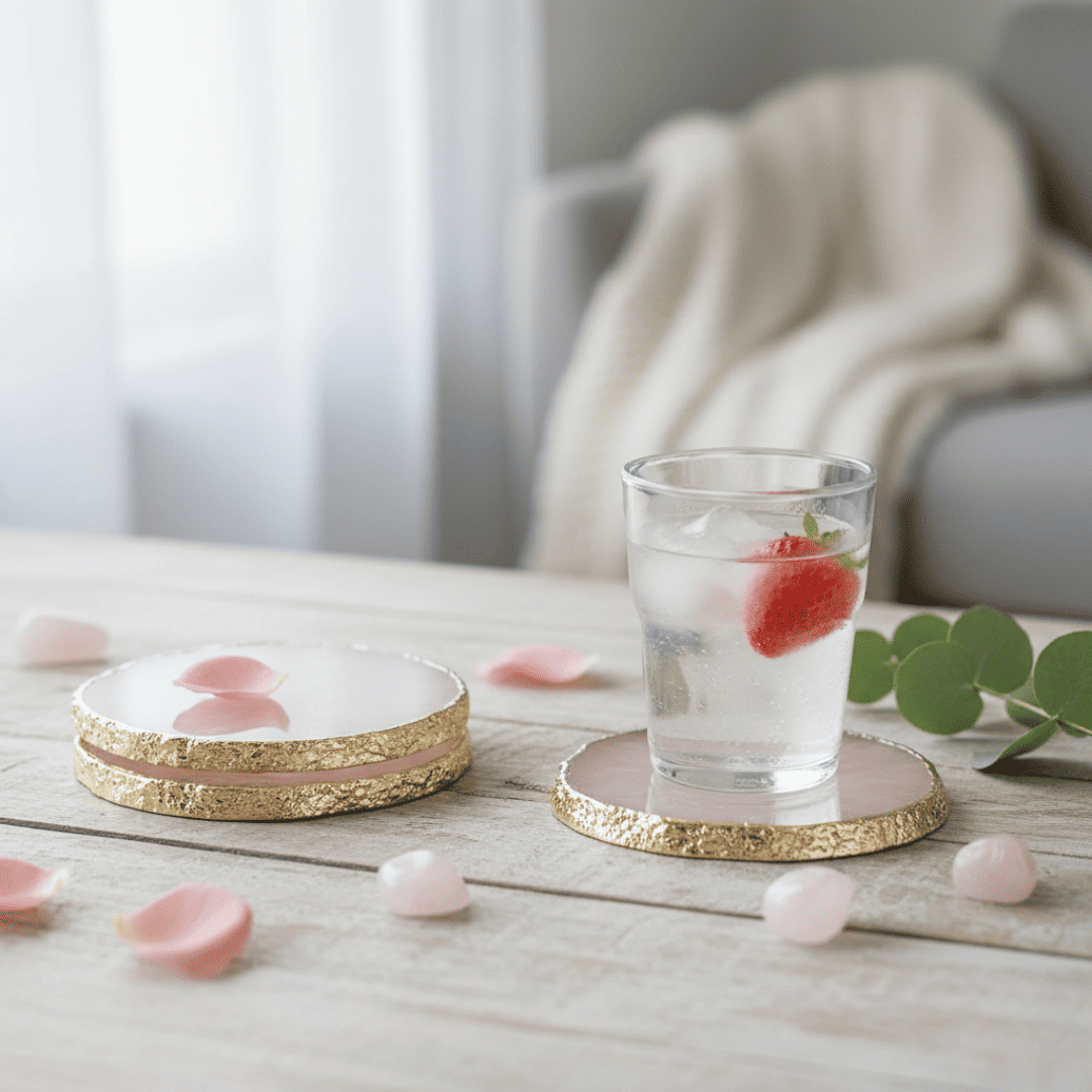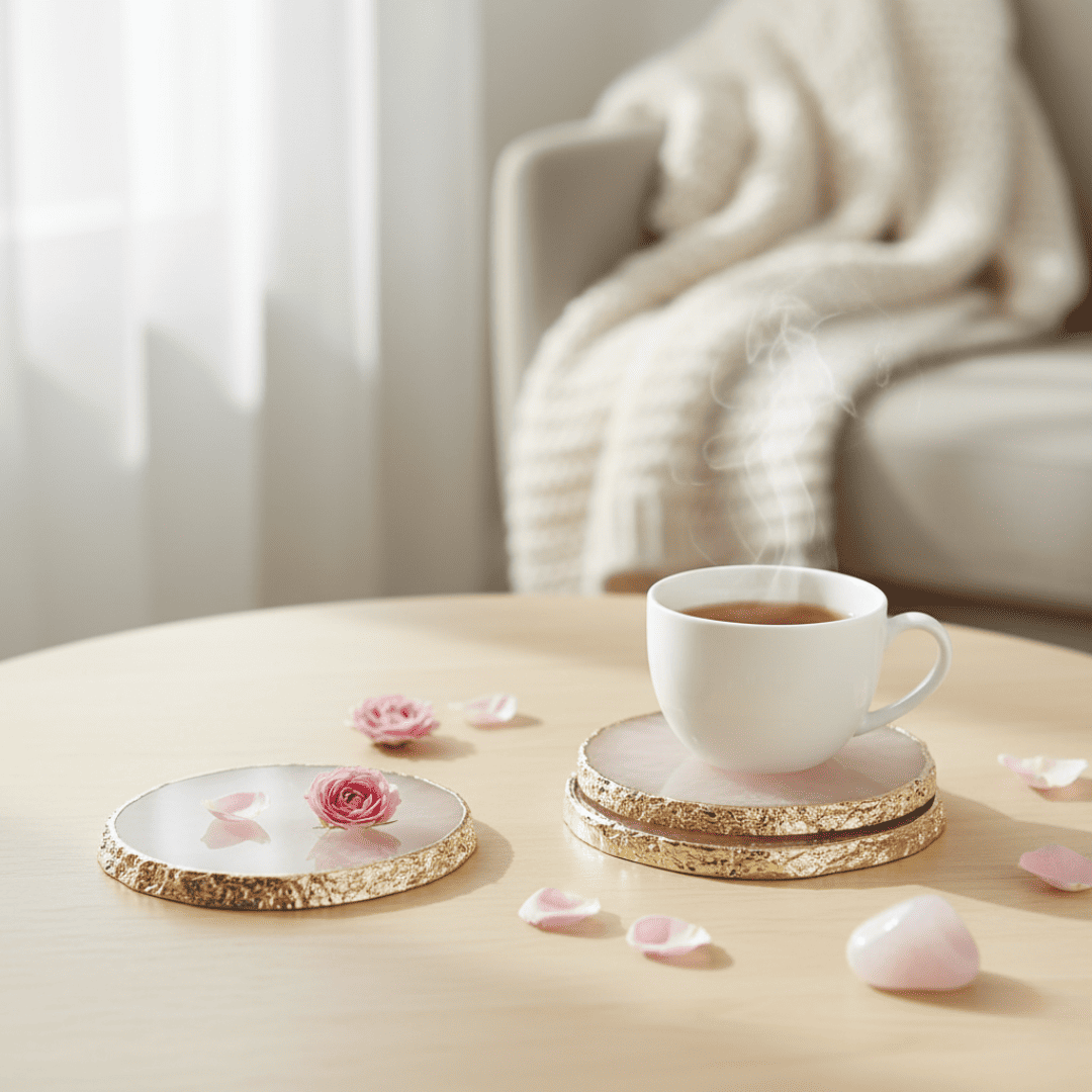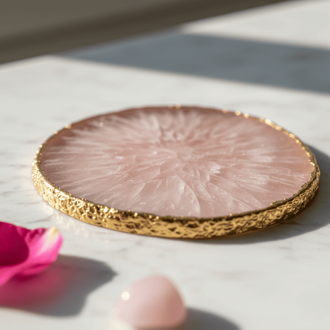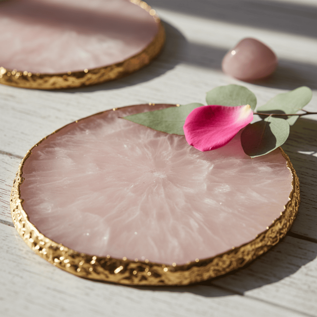 Bring a touch of elegance and powerful, soothing energy to your living space with this exquisite Natural Rose Quartz Coaster Set. Handcrafted from genuine Rose Quartz gemstones, each coaster radiates a gentle pink hue that symbolizes unconditional love, harmony, and compassion. The unique, gold-painted edges elevate the natural stone slice into a piece of luxurious, high-end decor.