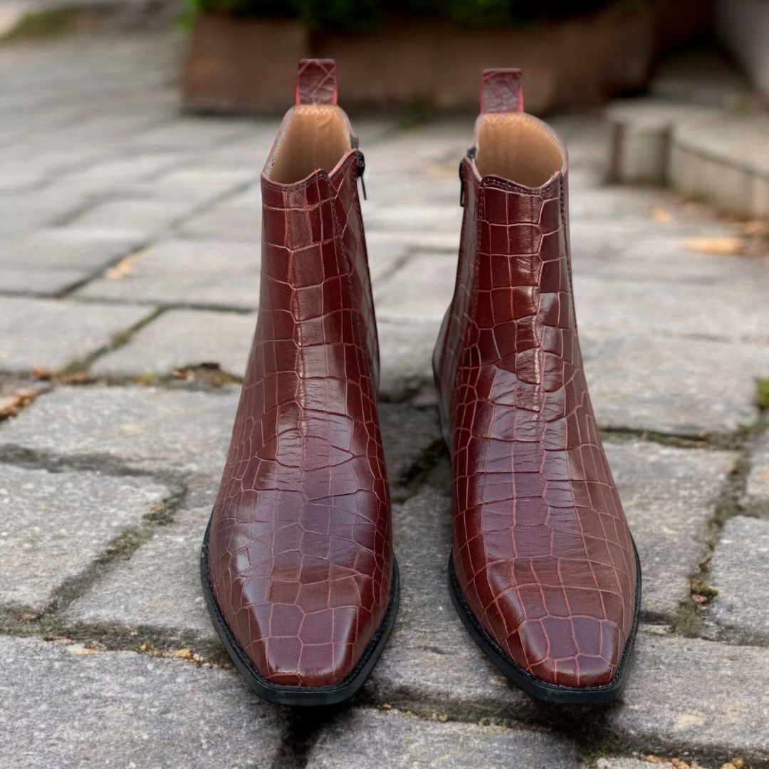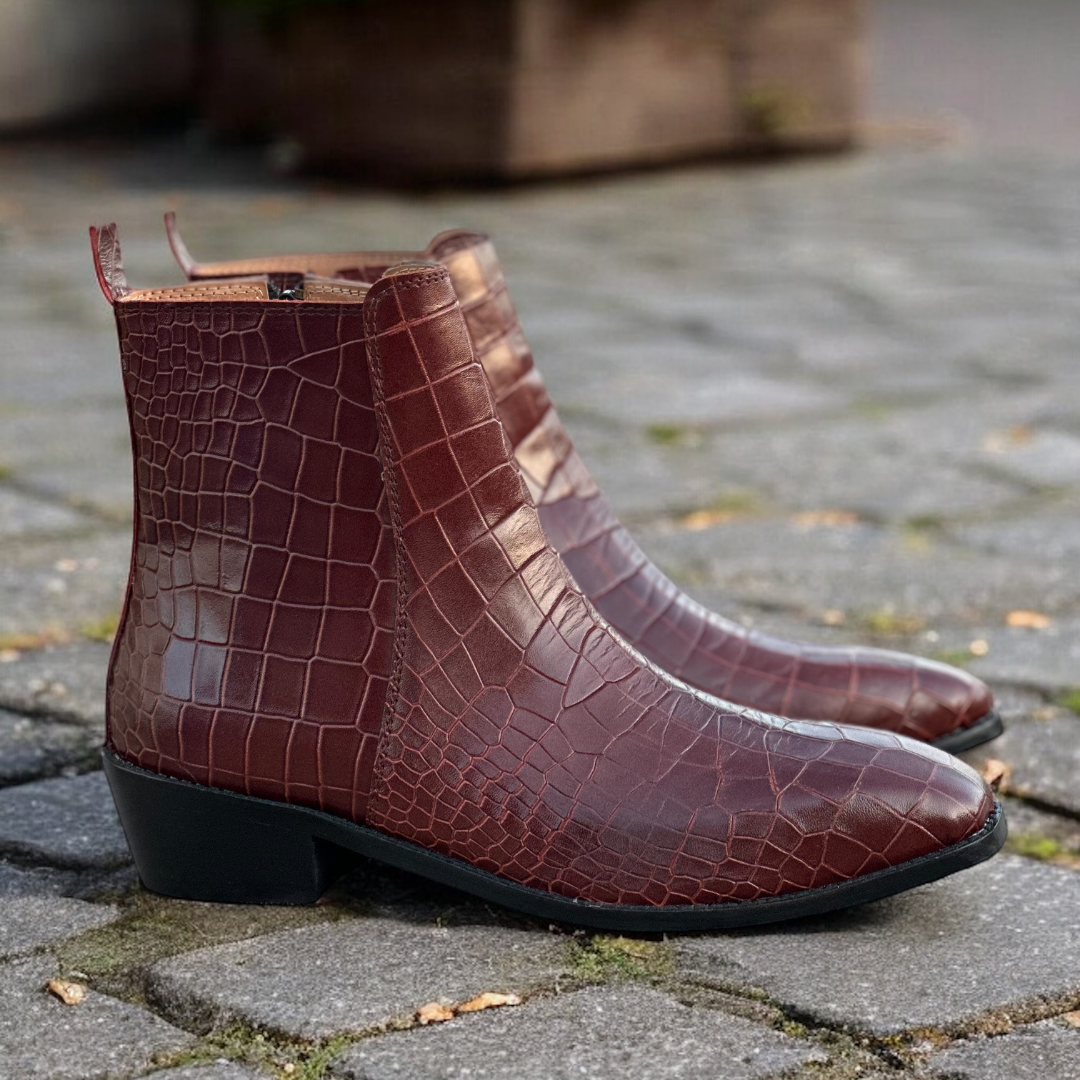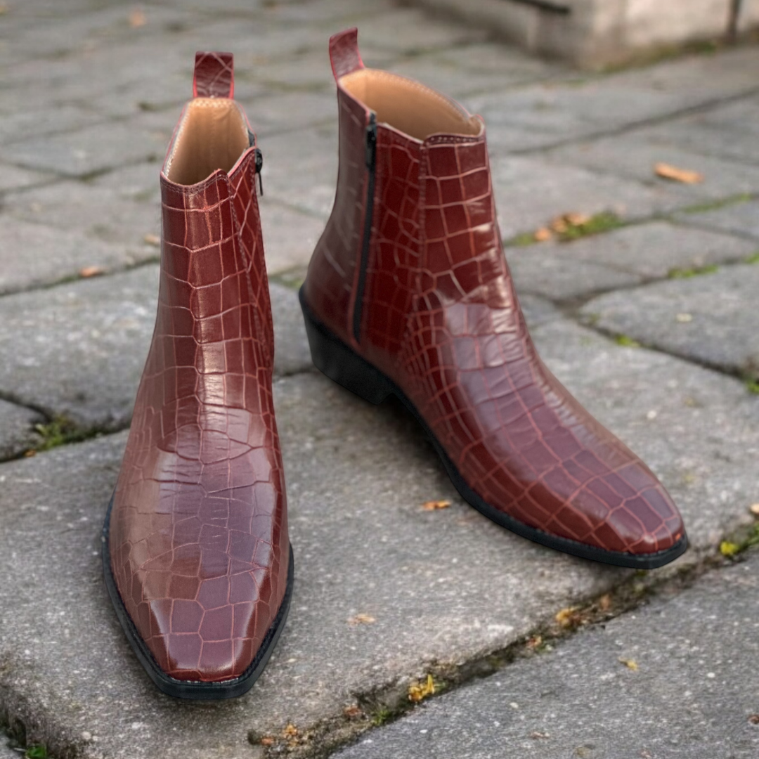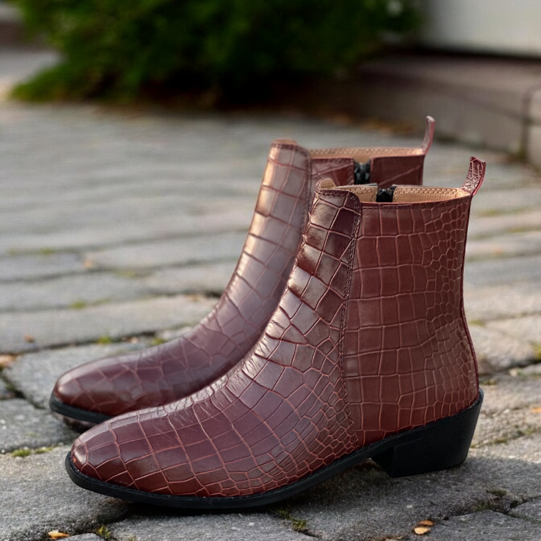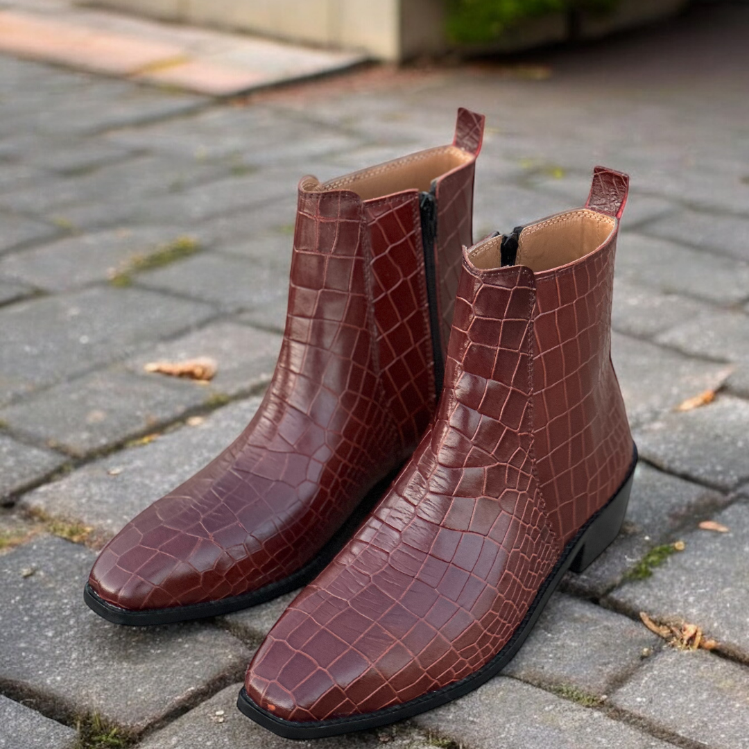 Crafted from luxurious croc-embossed leather in a rich chestnut hue, the Savage Croc Boots are the epitome of sophistication. Designed for effortless style, they feature a sleek side zipper for easy wear and a cushioned interior for all-day comfort. Whether dressing up or keeping it casual, these boots make a powerful statement—bold, refined, and undeniably timeless.