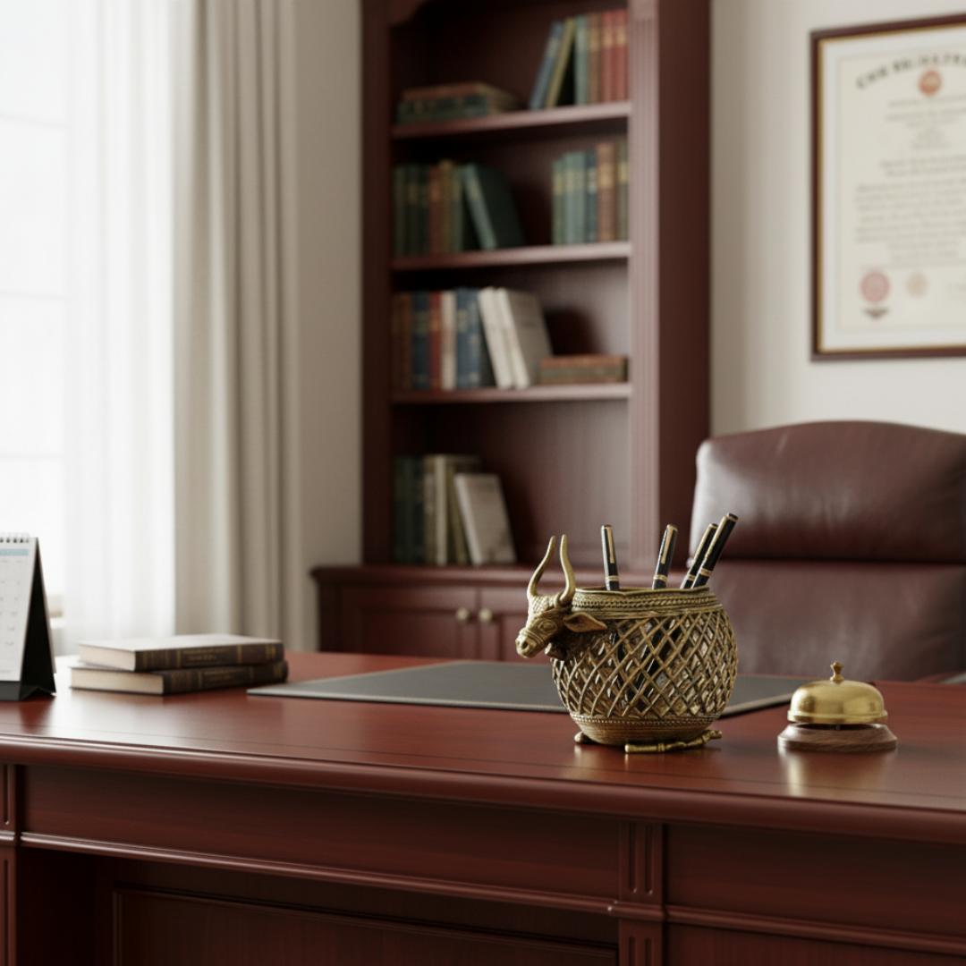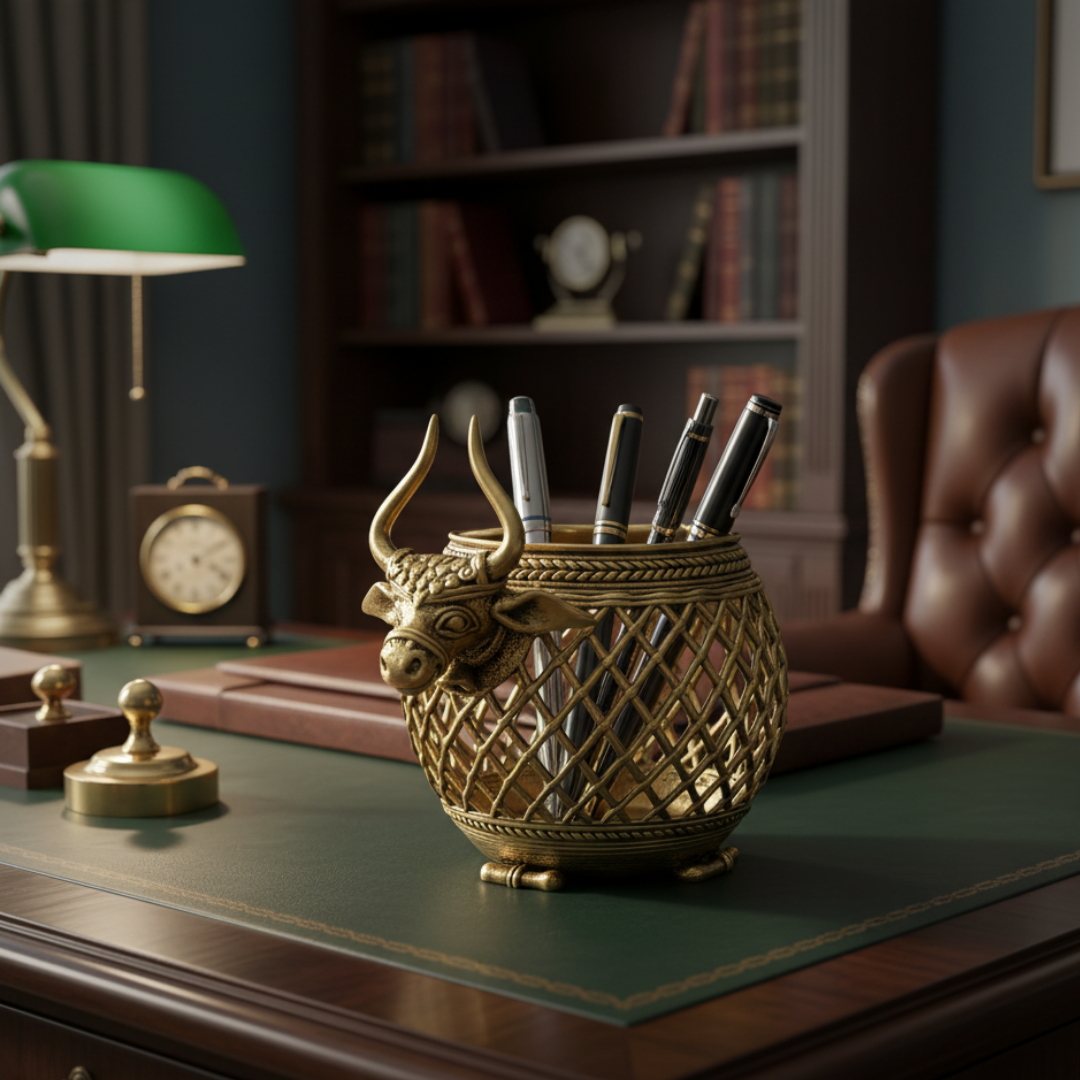 unique Brass handmade Dhokra Art Pen/Cutlery/ Tea Light Holder with very fine intricate mesh like art work depicting a Bull (nandi) sitting with his legs folded. Ideal for your home or as a gifting option. Made by expert tribal artisans of Chhattisgarh.