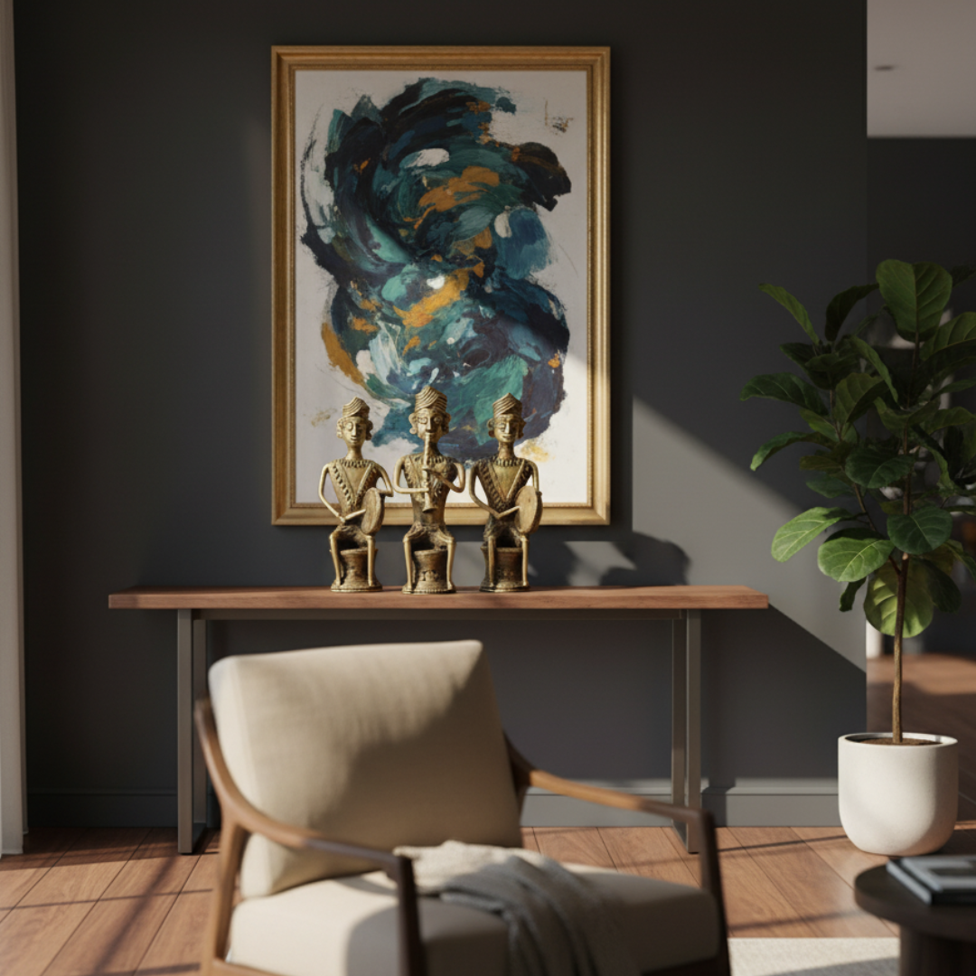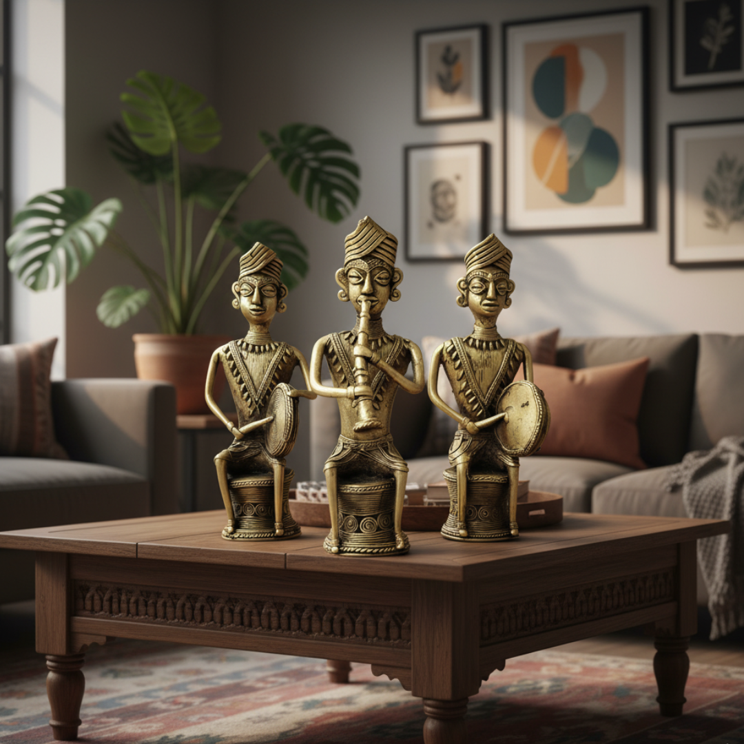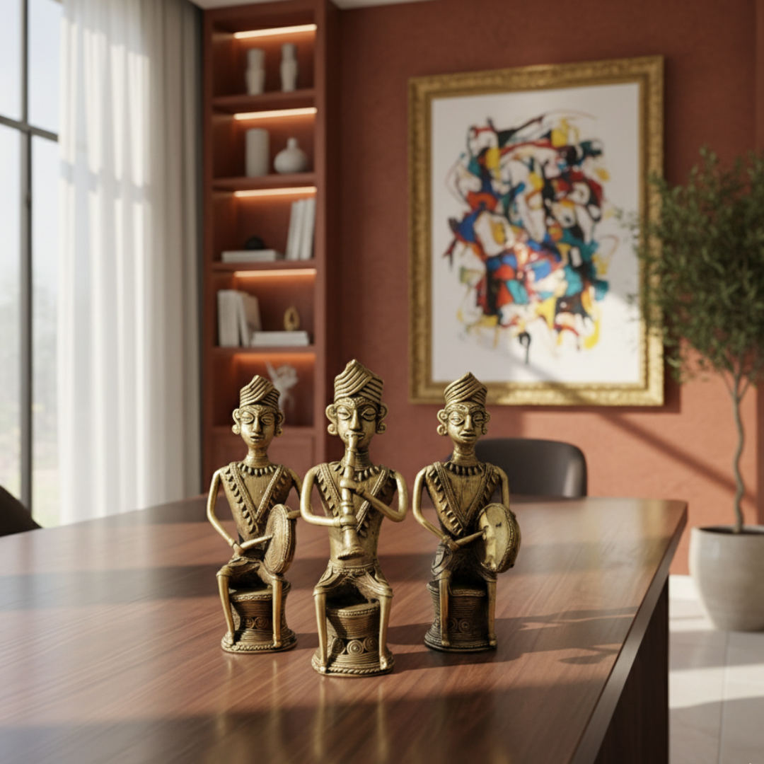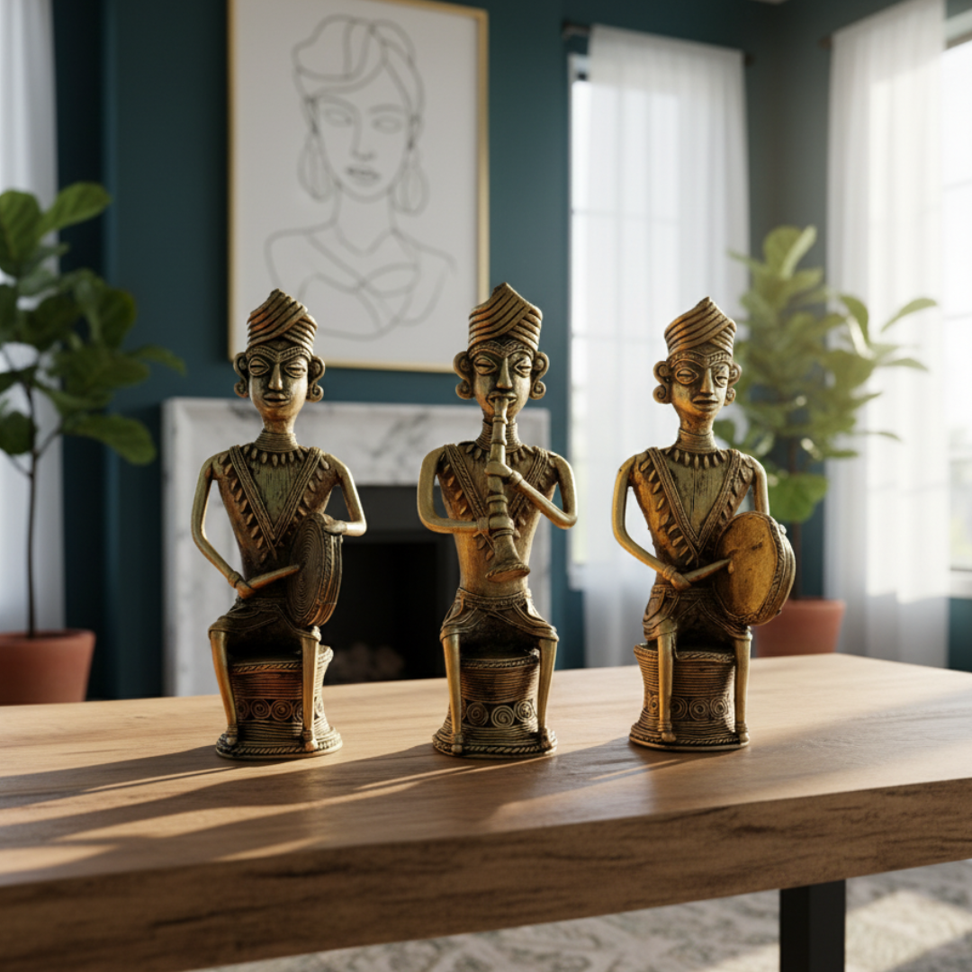 Beautiful and unique Dhokra art Set of Three Table Top Musicians made in bell metal (brass) by skilled artisans of Chhattisgarh.