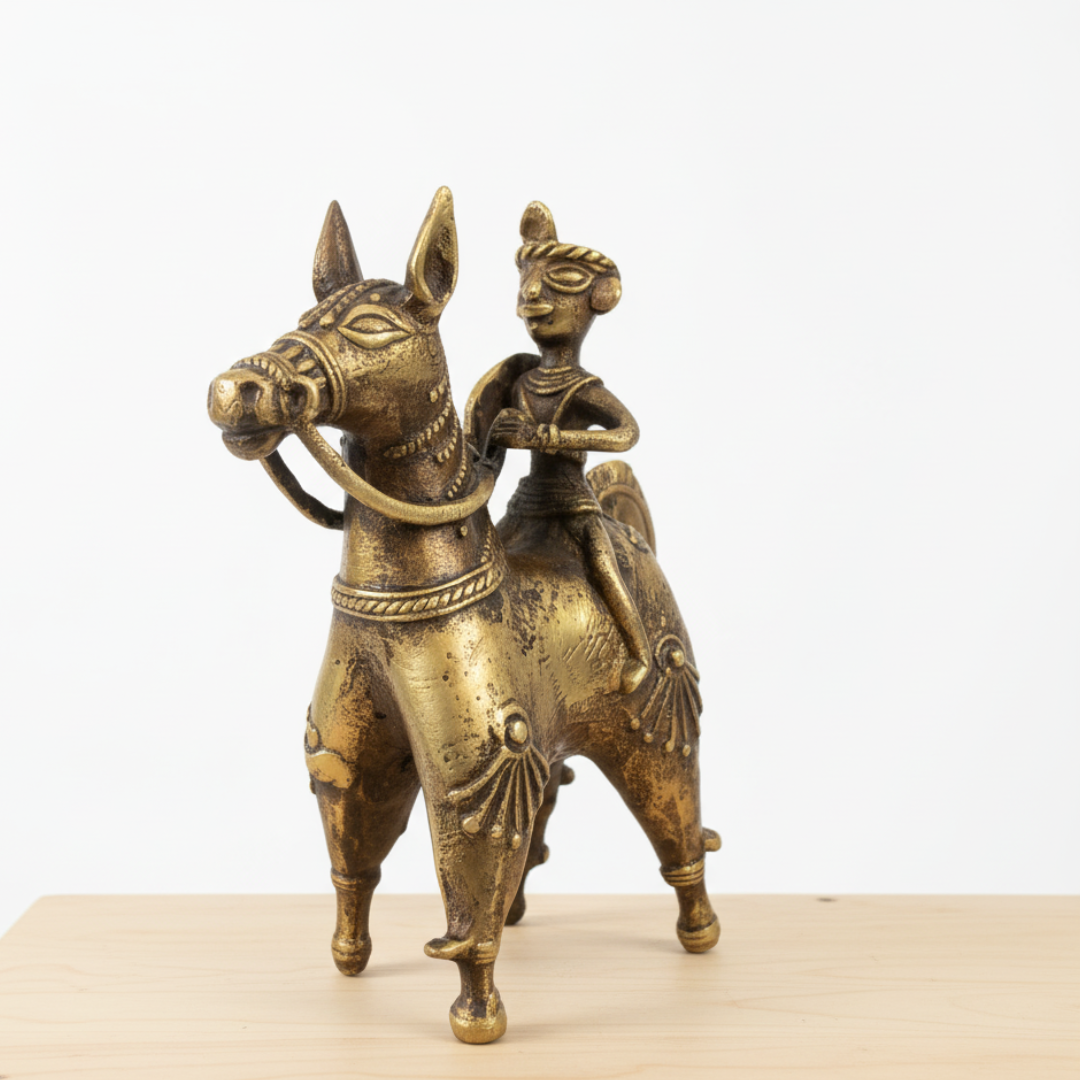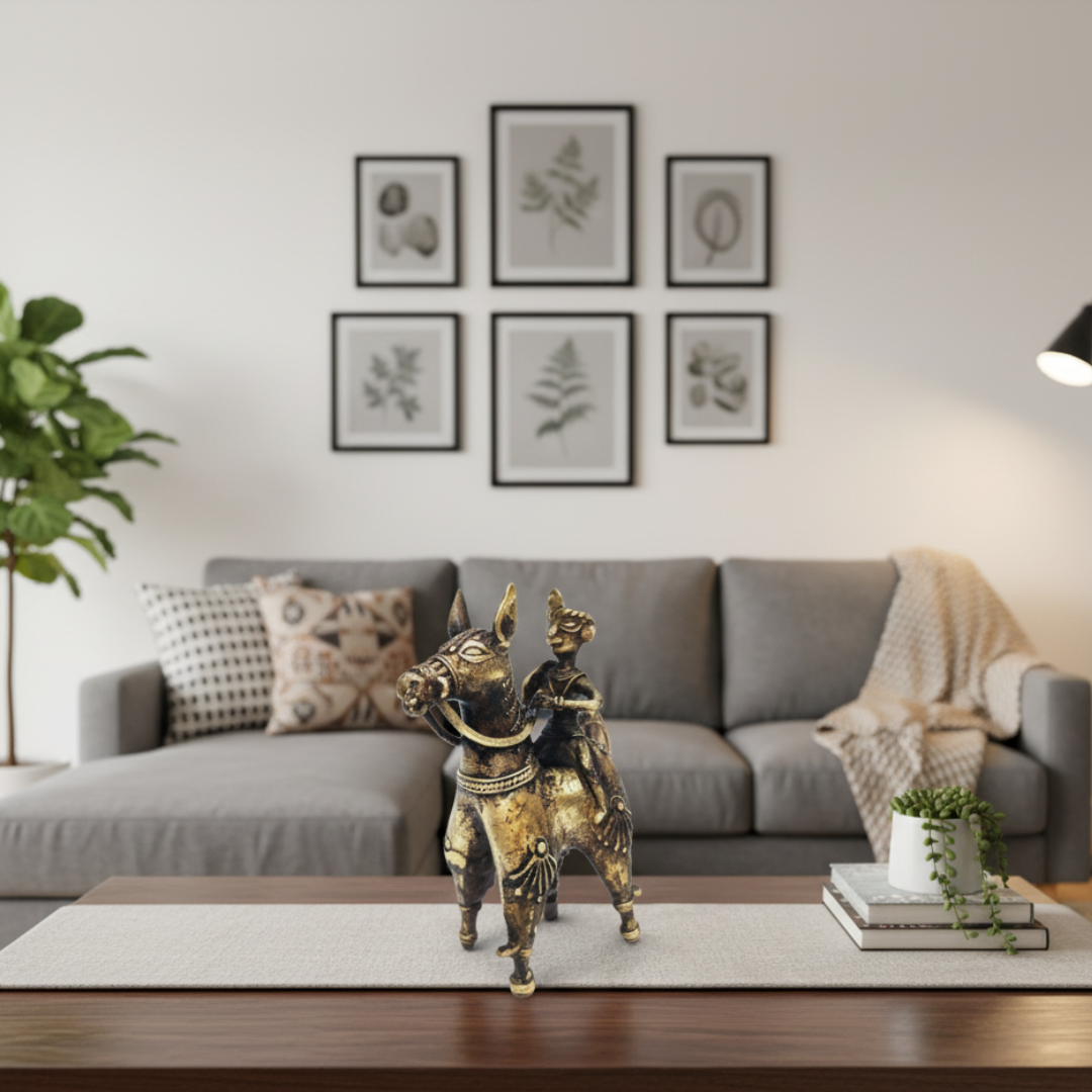 Dhokra Art Brass Antique Colored Statue (table top artefact) depicting a warrior riding a horse.